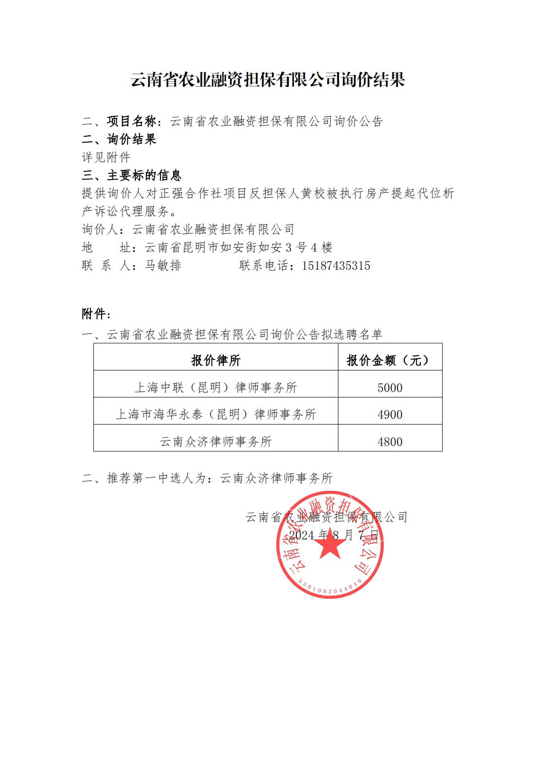 云南省農(nóng)業(yè)融資擔保有限公司詢價結(jié)果