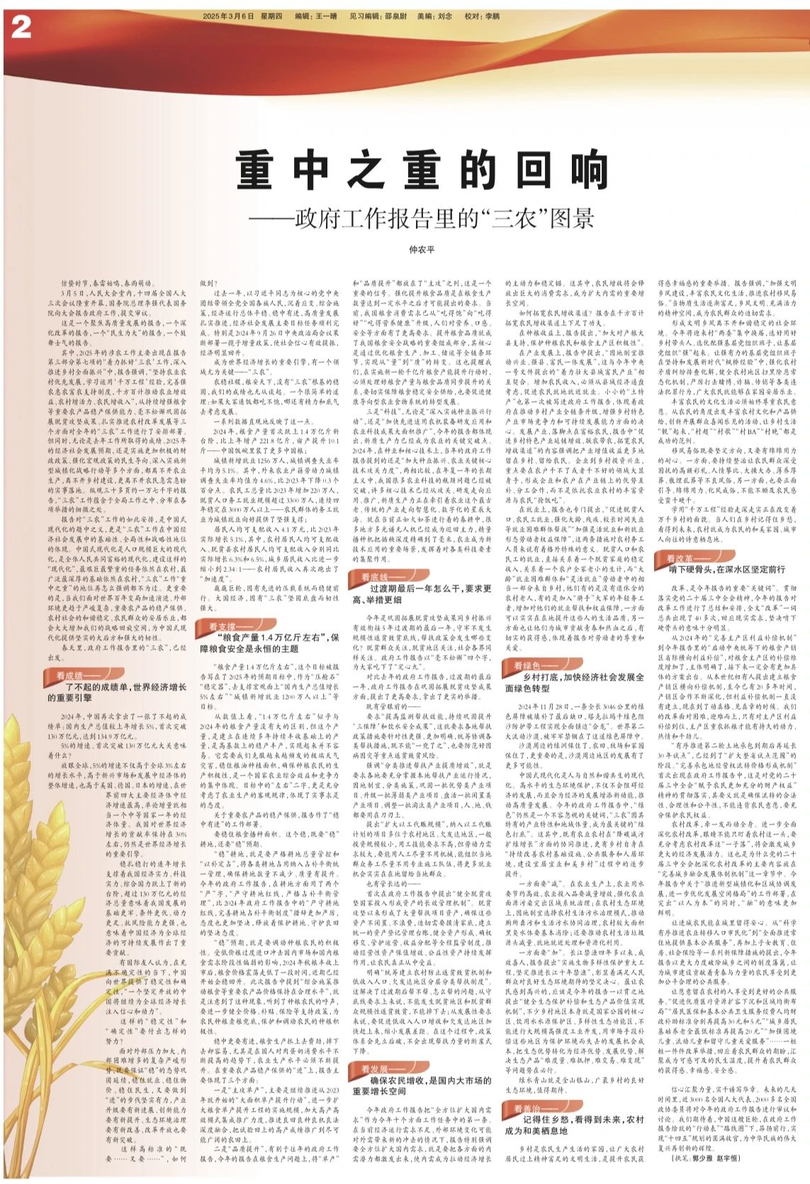 其中,2025年的涉農(nóng)工作主要出現(xiàn)在報告第三部分第七項的“著力抓好‘三農(nóng)’工作,深入推進鄉(xiāng)村全面振興”中,報告強調(diào),“堅持農(nóng)業(yè)農(nóng)村優(yōu)先發(fā)展,學(xué)習(xí)運用‘千萬工程’經(jīng)驗,完善強農(nóng)惠農(nóng)富農(nóng)支持制度,千方百計推動農(nóng)業(yè)增效益、農(nóng)村增活力、農(nóng)民增收入”,從持續(xù)增強糧食等重要農(nóng)產(chǎn)品穩(wěn)產(chǎn)保供能力、毫不松懈鞏固拓展脫貧攻堅成果、扎實推進農(nóng)村改革發(fā)展等三個方面對全年的“三農(nóng)”工作進行了安排部署。但同時,無論是去年工作所取得的成績、2025年的經(jīng)濟社會發(fā)展預(yù)期,還是實施更加積極的財政政策、強化宏觀政策的民生導(dǎo)向、深入實施新型城鎮(zhèn)化戰(zhàn)略行動等多個方面,都離不開農(nóng)業(yè)生產(chǎn),離不開鄉(xiāng)村建設(shè),更離不開農(nóng)民急需急盼的實事落地??v觀三十多頁約一萬七千字的報告,“三農(nóng)”工作蘊含于全局工作之中、分布在各項舉措的細微之處。