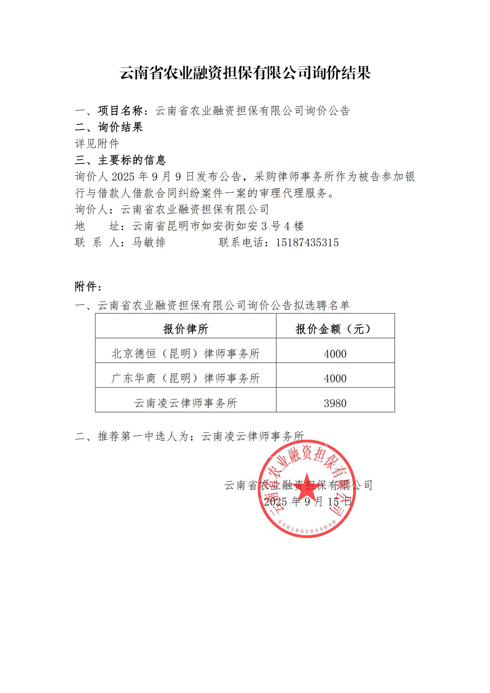 云南省農(nóng)業(yè)融資擔(dān)保有限公司詢價結(jié)果