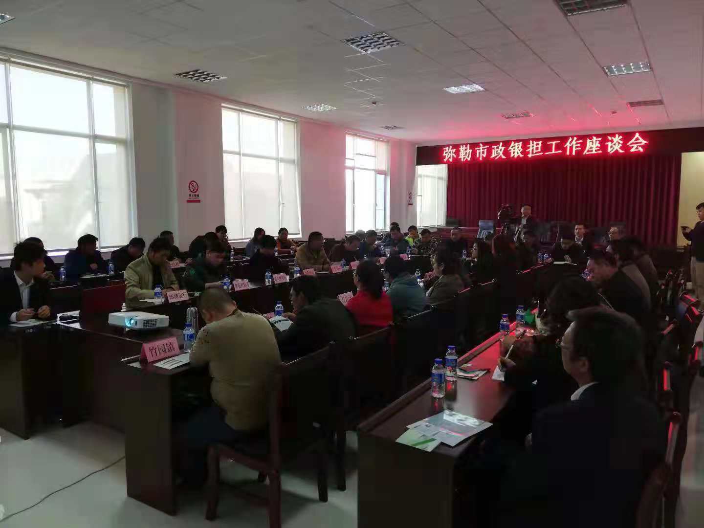 2018年11月28日,省農(nóng)擔(dān)公司彌勒辦事處負(fù)責(zé)人趙閆攜辦事處工作人員參加彌勒市政銀擔(dān)工作座談會。參會單位有彌勒市市政府、財政局、農(nóng)科局、市人民銀行、郵儲銀行、各鄉(xiāng)鎮(zhèn)負(fù)責(zé)人等30余家彌勒市中小微企業(yè)代表。