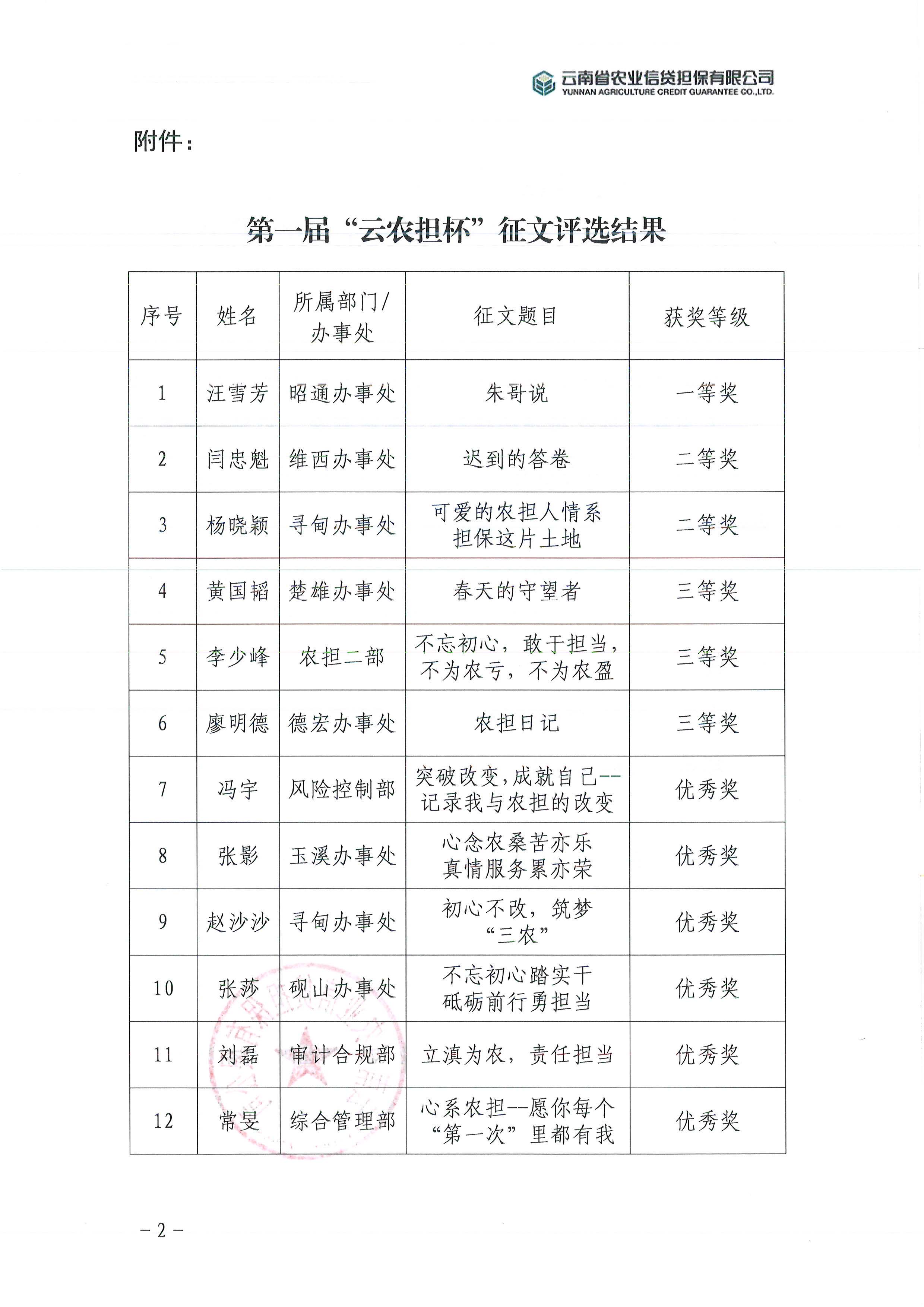 云南省農(nóng)業(yè)信貸擔(dān)保公司第一屆“云農(nóng)擔(dān)杯”征文活動(dòng)結(jié)果公示各部門、辦事處: