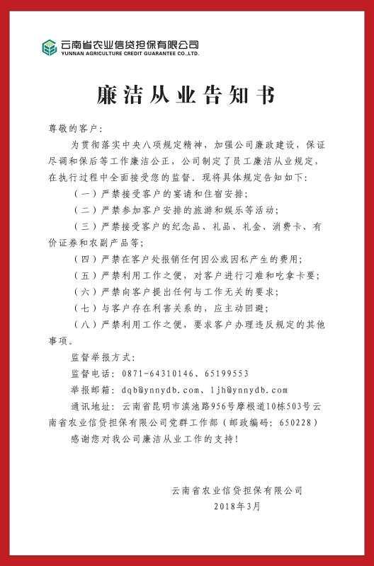 為貫徹中央八項(xiàng)規(guī)定精神,落實(shí)黨風(fēng)廉政建設(shè)責(zé)任制要求,保證公司在業(yè)務(wù)盡調(diào)和開展保后等工作中的廉潔公正,公司在業(yè)務(wù)開展中推行“一杯水”原則--“我們能接受的,只是客戶的一杯水”?!耙槐痹瓌t,要求員工到客戶處開展業(yè)務(wù),原則上只能喝一杯水。同時(shí),公司制定了員工廉潔從業(yè)規(guī)定,并制作《廉潔從業(yè)告知書》,要求公司員工從2018年3月1日起,對(duì)已立項(xiàng)客戶開展業(yè)務(wù)盡調(diào)時(shí),要將帶有編號(hào)的《廉潔從業(yè)告知書》遞交客戶,客戶簽收后將回執(zhí)聯(lián)收回,同時(shí)公司采取不定期致電客戶方式抽查《廉潔從業(yè)告知書》發(fā)放情況,確保立項(xiàng)并開展盡調(diào)的每一戶客戶都能收到《廉潔從業(yè)告知書》。公司還制作了“一杯水”原則和《廉潔從業(yè)告知書》掛圖,作為公司廉政文化建設(shè)部分加強(qiáng)員工的廉潔教育宣傳。