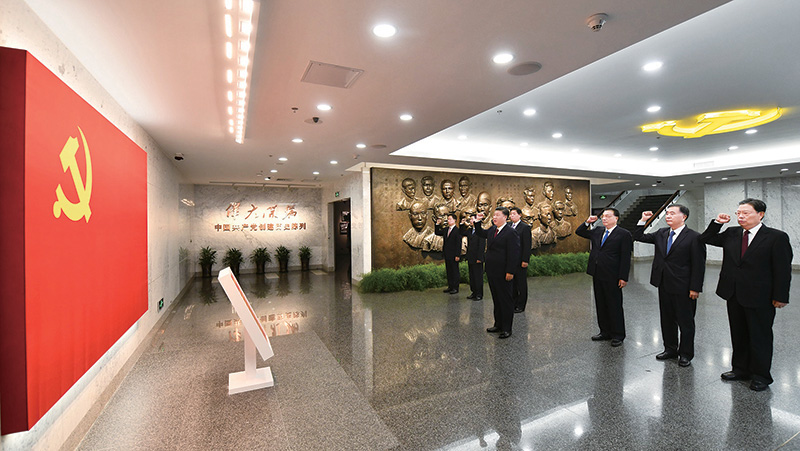 2017年10月31日,中共中央總書記、國家主席、中央軍委主席習(xí)近平帶領(lǐng)中共中央政治局常委李克強、栗戰(zhàn)書、汪洋、王滬寧、趙樂際、韓正,瞻仰上海中共一大會址和浙江嘉興南湖紅船。這是31日上午,在上海中共一大會址紀(jì)念館,習(xí)近平帶領(lǐng)其他中共中央政治局常委同志一起重溫入黨誓詞。
