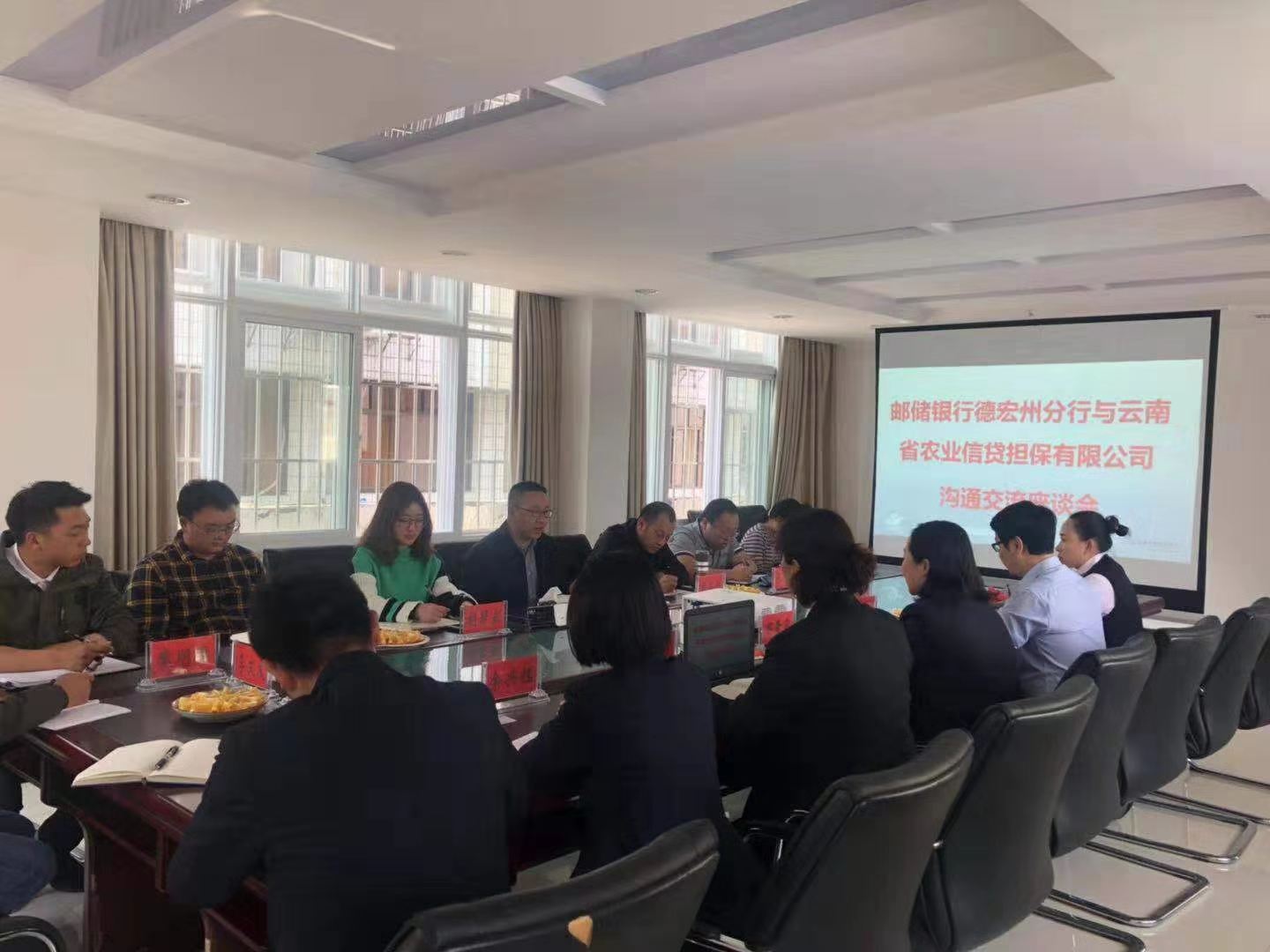 2019年2月19日下午,農擔公司副總經理廖寅皓、風控部負責人張長浩、農擔二部負責人賈萬文、機構合作部負責人蔡菲帶領德宏辦事處人員至郵儲銀行德宏州分行,與郵儲銀行德宏州分行副行長鄭素霞,小企業(yè)金融部總經理劉娜,個貸部總經理吳剛林進行交流座談。