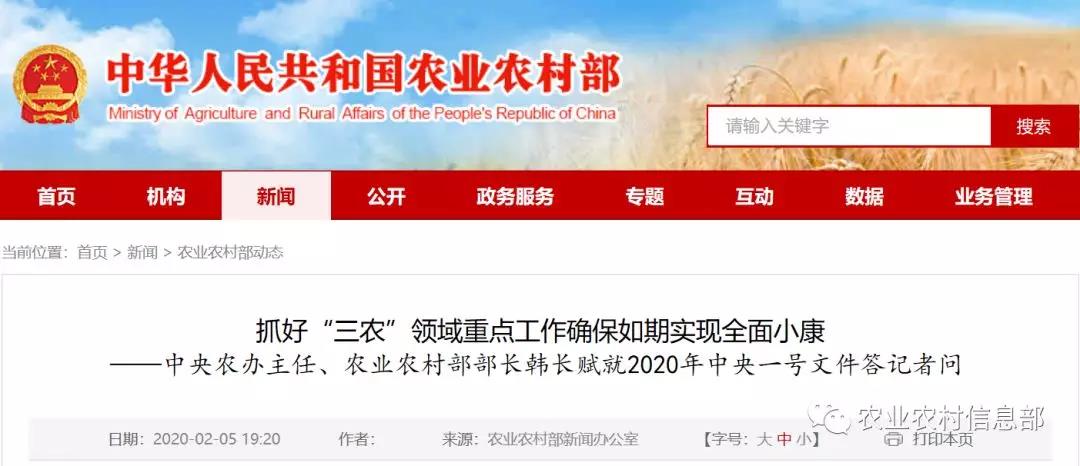 近日,中共中央、國務(wù)院印發(fā)《關(guān)于抓好“三農(nóng)”領(lǐng)域重點(diǎn)工作確保如期實(shí)現(xiàn)全面小康的意見》,也就是2020年中央一號(hào)文件。文件公開發(fā)布之際,中央農(nóng)辦主任、農(nóng)業(yè)農(nóng)村部部長韓長賦就文件制定印發(fā)和貫徹落實(shí)等問題,回答了記者的提問。
