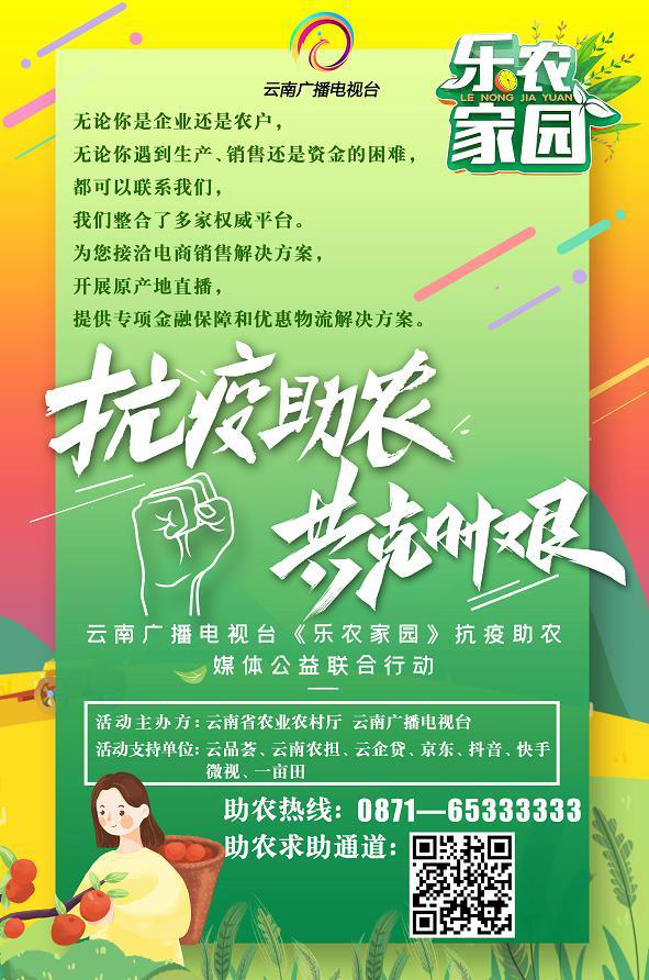面對疫情,我們眾志成城,攜手助農!從2020年3月1日起至6月1日,由云南省農業(yè)農村廳、云南廣播電視臺共同發(fā)起,針對云南省農業(yè)生產地區(qū)、企業(yè)或個人遇到的生產、銷售、資金等問題,開展“抗疫助農,共克時艱”公益助農活動。