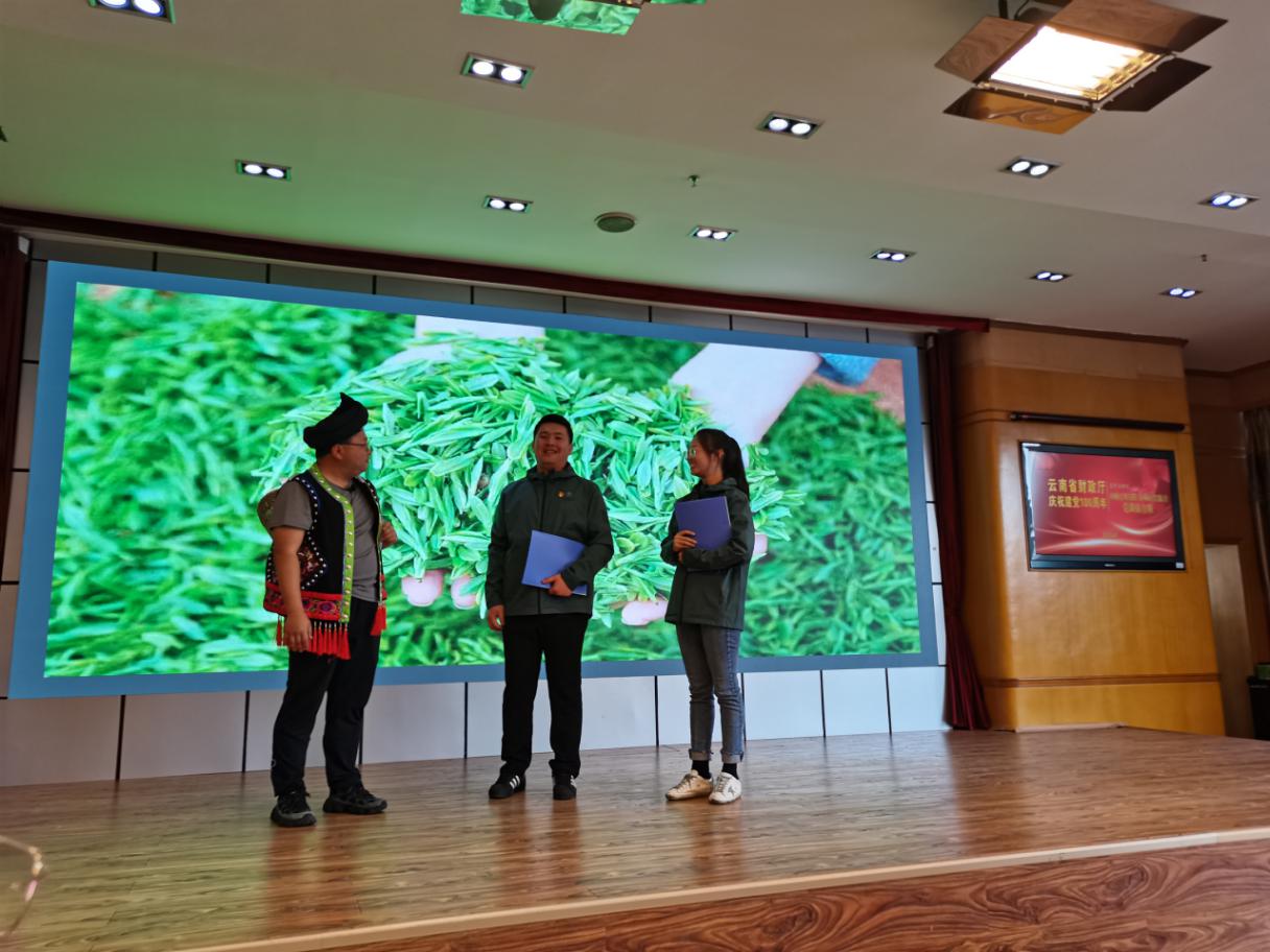 首場黨課接力賽共有4個黨支部組隊參加,公司黨總支作為最后一支參賽隊出場。公司黨總支參賽黨課結合農擔業(yè)務實際,以“助農路上感黨恩”為主題,通過情景劇方式,從業(yè)務工作場景契入,以時間為軸,由13名黨員職工分別演繹了扎西會議、云南第一個黨支部建立、紅軍過迪慶故事、阿佤人民唱新歌、共克貧困奔小康等5個故事,深情講述了云南黨史上廣為流傳的紅色故事、難忘的光輝時刻,以及黨的好政策。公司黨總支部副書記、董事長杜開波主持了講黨課活動。