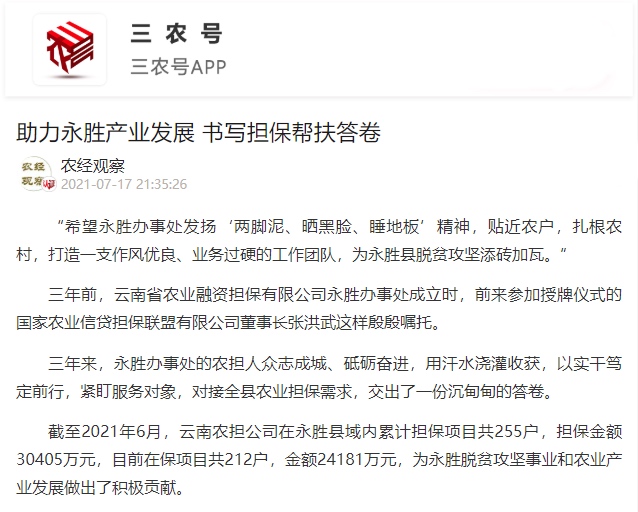 云南農(nóng)擔(dān)永勝辦事處自2019年8月22日成立,充分彰顯了云南農(nóng)擔(dān)服務(wù)網(wǎng)絡(luò)擴(kuò)面下沉的深度和力度,也體現(xiàn)了國(guó)家農(nóng)擔(dān)對(duì)云南省鄉(xiāng)村振興戰(zhàn)略實(shí)施的大力支持。2021年7月17日,《農(nóng)民日?qǐng)?bào)》三農(nóng)號(hào)以“助力永勝產(chǎn)業(yè)發(fā)展 書(shū)寫(xiě)擔(dān)保幫扶答卷”為題對(duì)云南農(nóng)擔(dān)永勝辦事處進(jìn)行了專(zhuān)題報(bào)道。以下是詳細(xì)內(nèi)容: