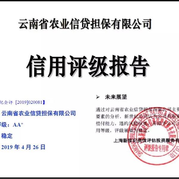云南省農(nóng)業(yè)信貸擔(dān)保有限公司獲得AA+企業(yè)主體信用評(píng)級(jí)